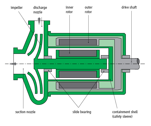 Centrifugalna pumpa s magnetnom spojnicom je kombinacija konvencionalne hidraulike pumpe s trajnom-magnetnim pogonskim sistemom i trofaznim motorom.